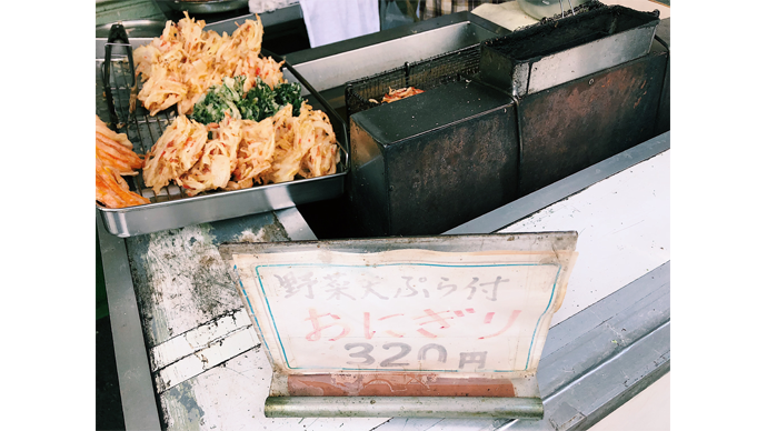 ほくほくのおむすびと、野菜の天ぷら、漬物までついて320円。